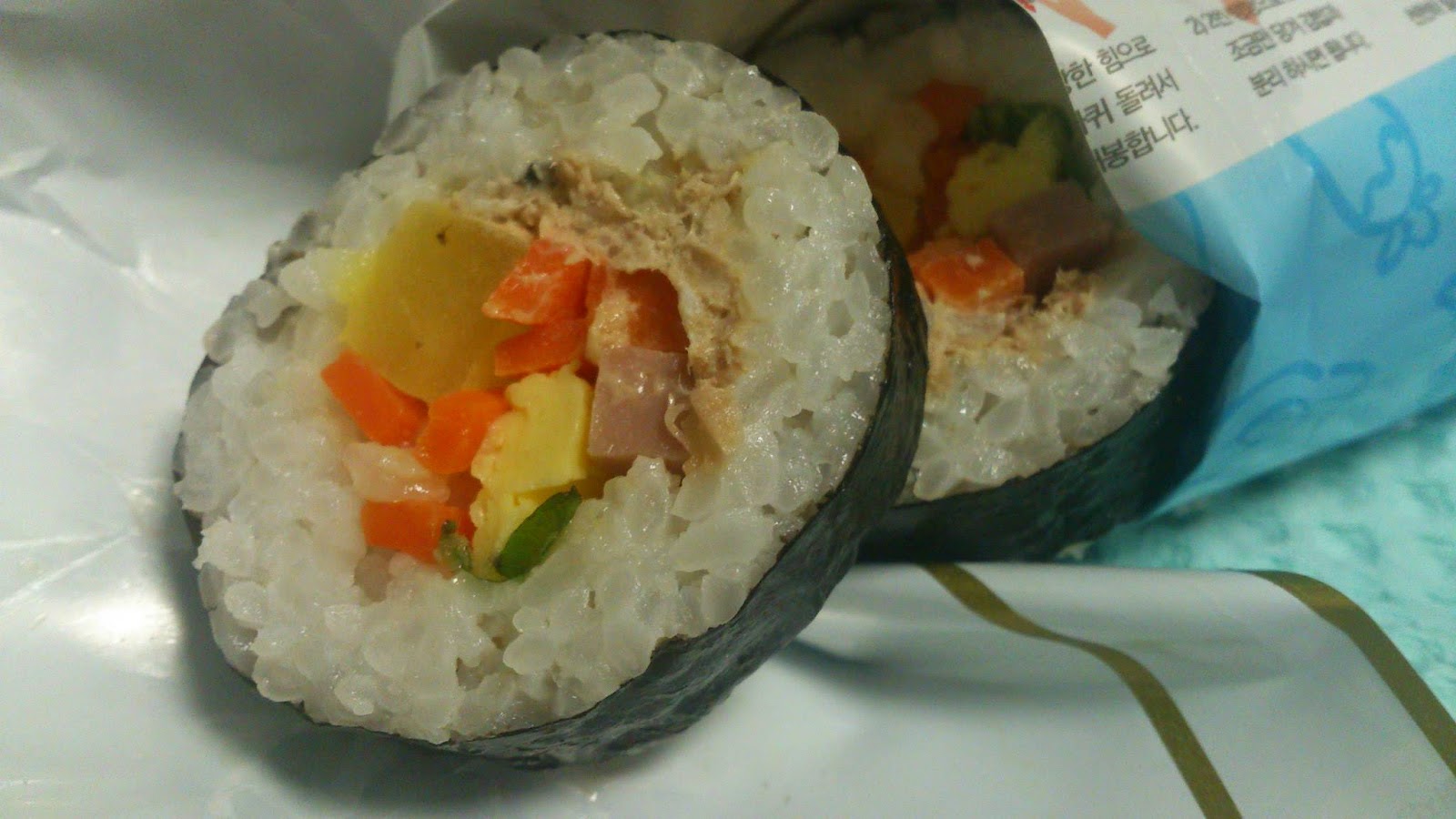 Kimbap (김밥) is the Korean version on sushi! The main ingredients are seaweed (kim) for wrapping of course, and rice (bap). In the picture we have tuna-kimbap with additional vegetables, egg etc.
